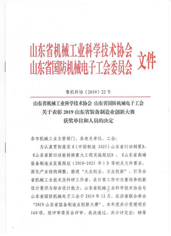 山東省裝備制造業(yè)創(chuàng)新大賽二等獎